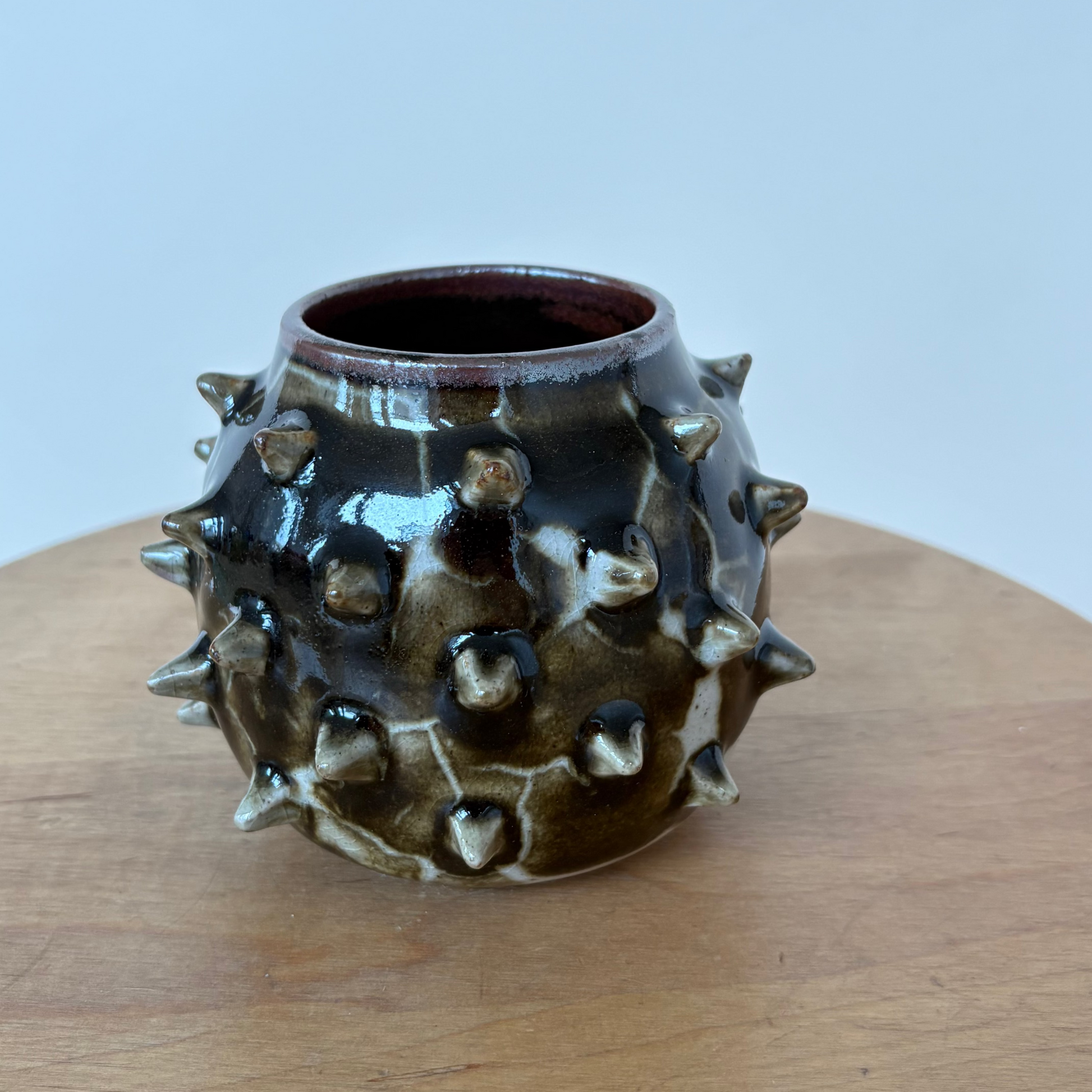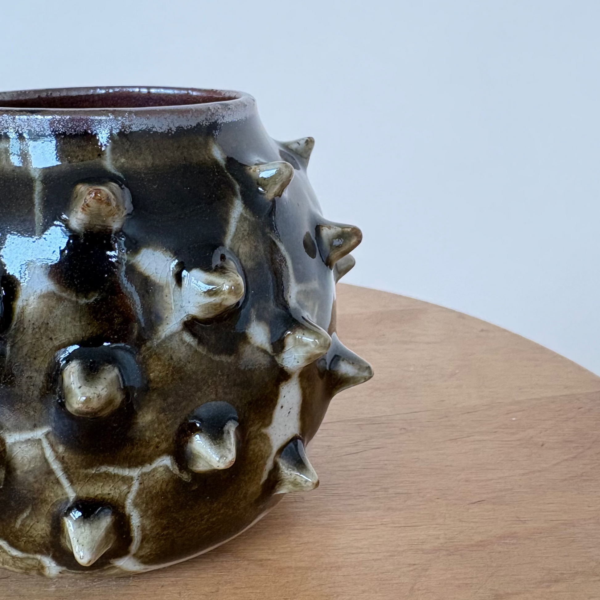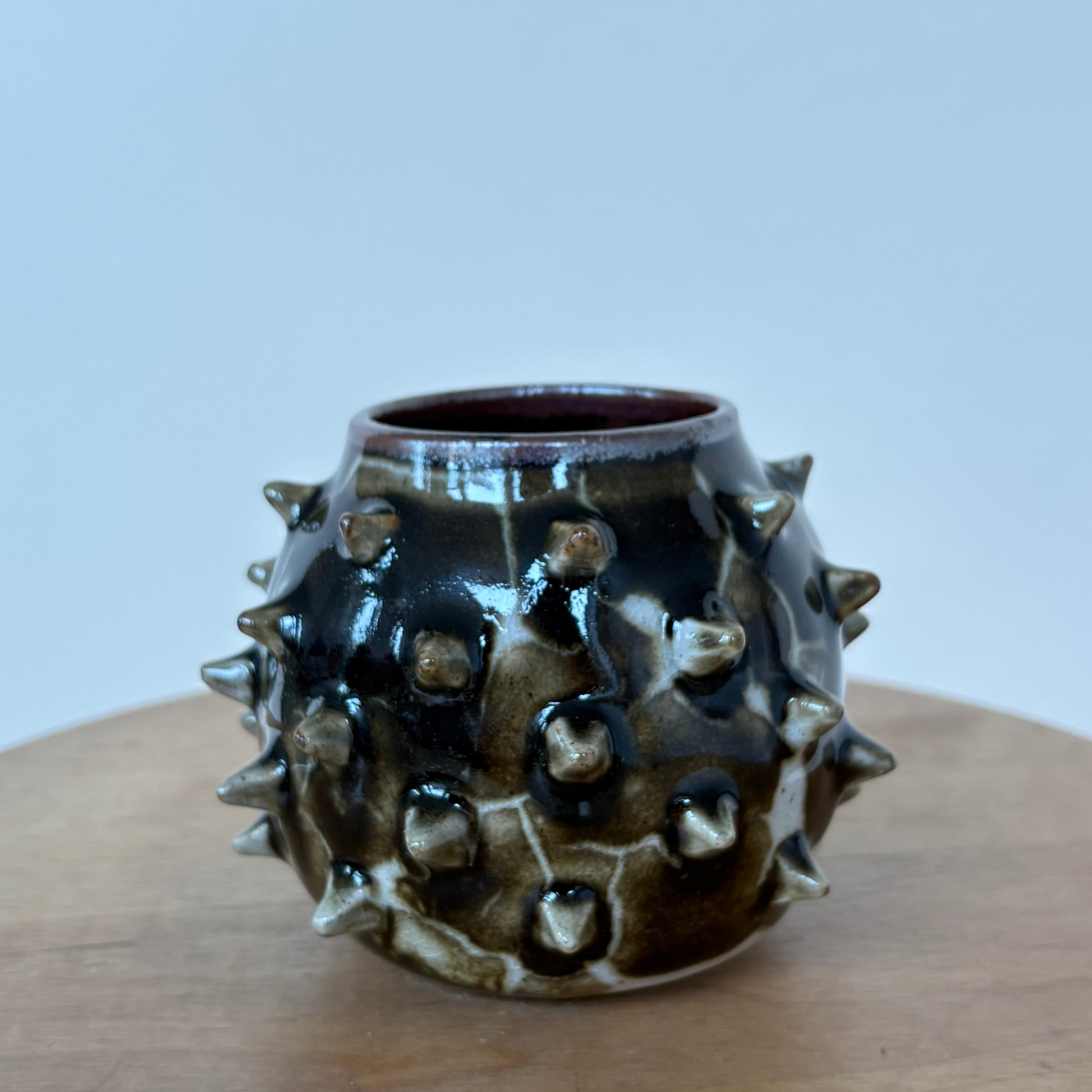 Small spiked vase on white stoneware. Individually made spikes, with a glossy, lightning-like glaze combo. Hues of red, green, brown and black.