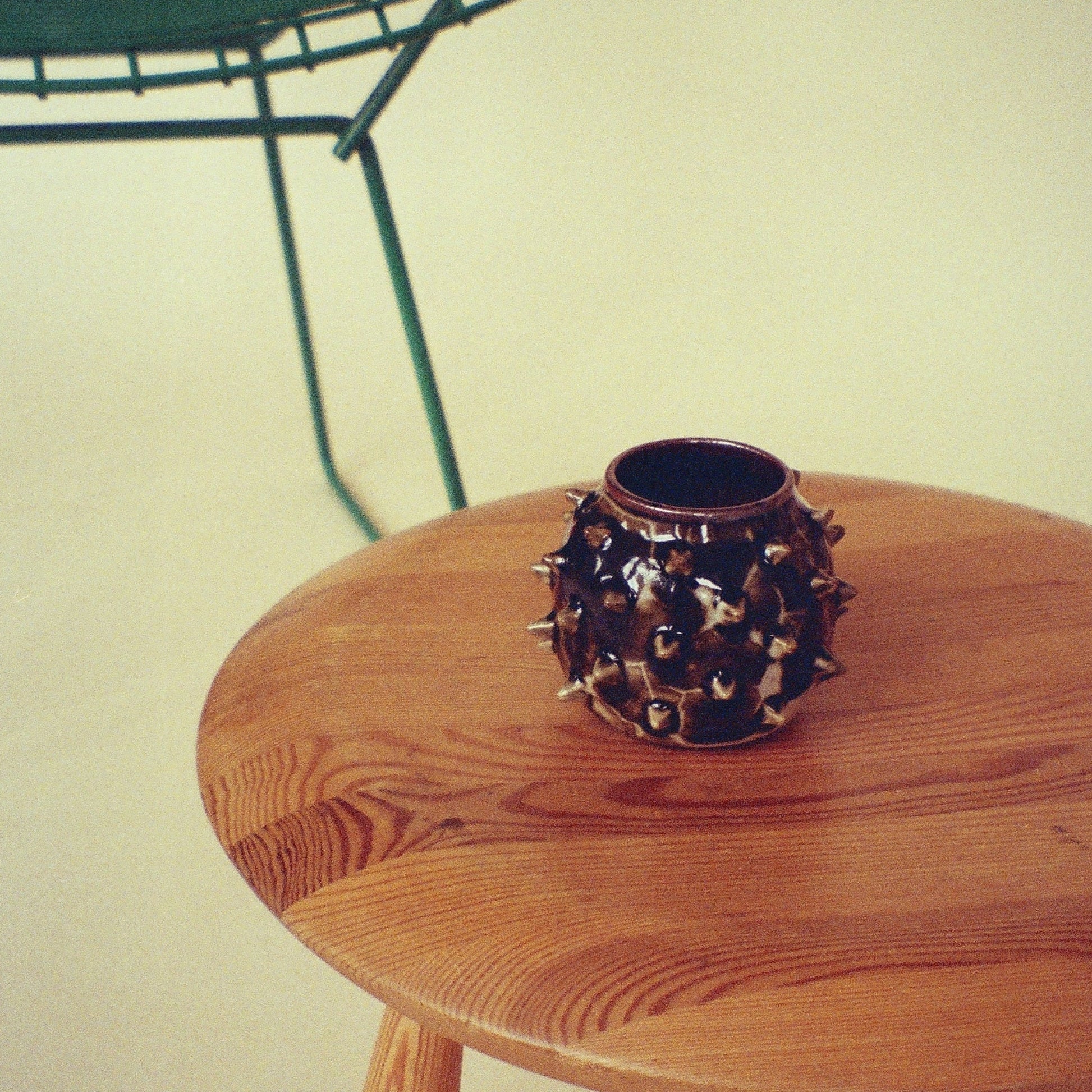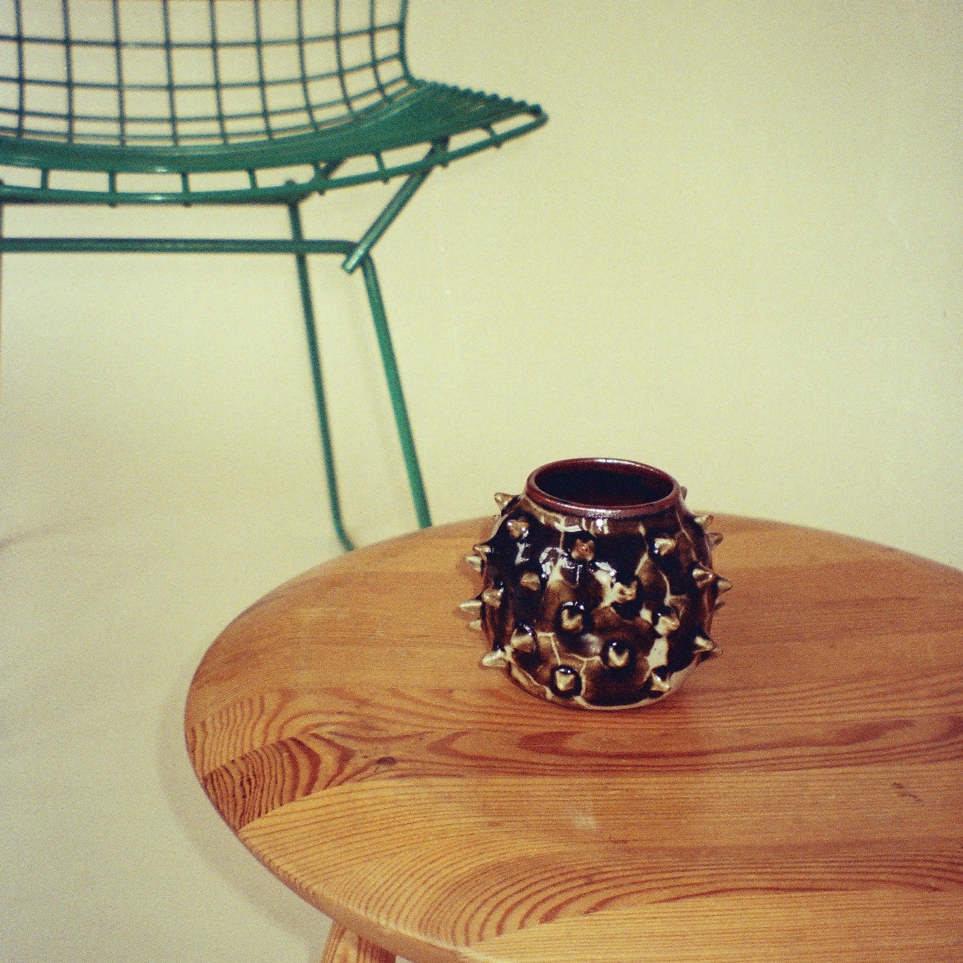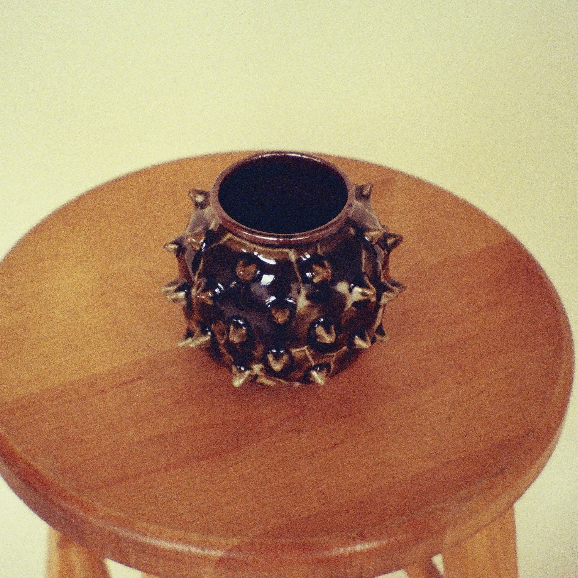 Small spiked vase on white stoneware. Individually made spikes, with a glossy, lightning-like glaze combo. Hues of red, green, brown and black.
