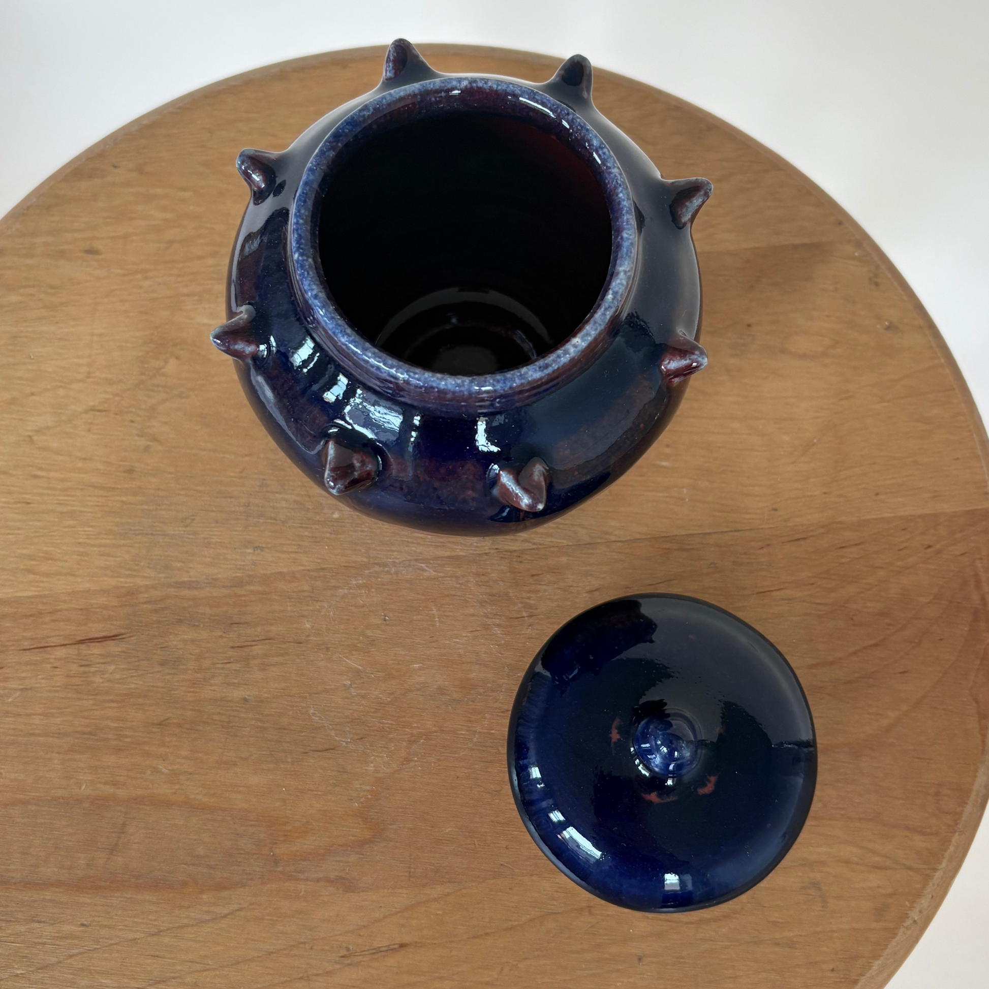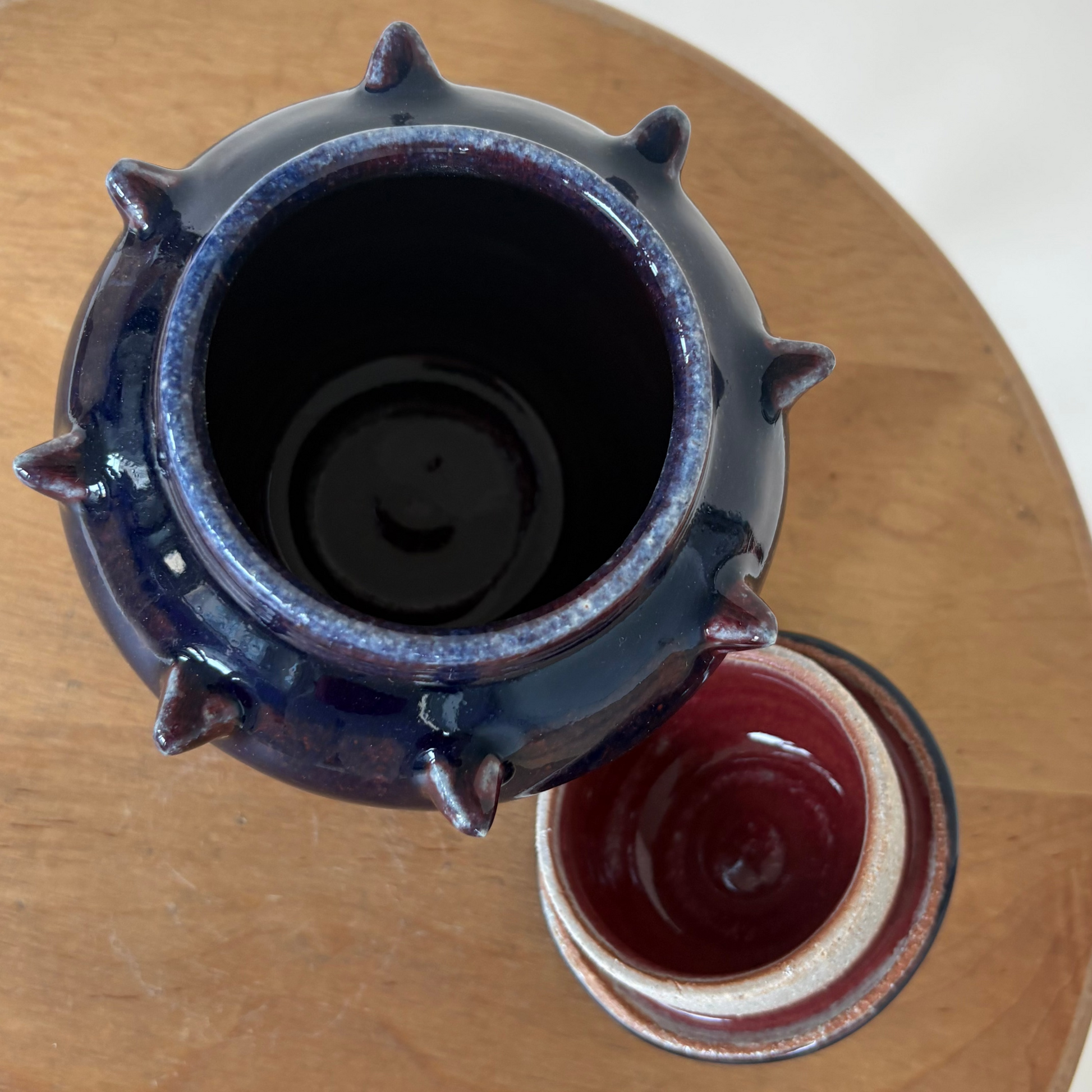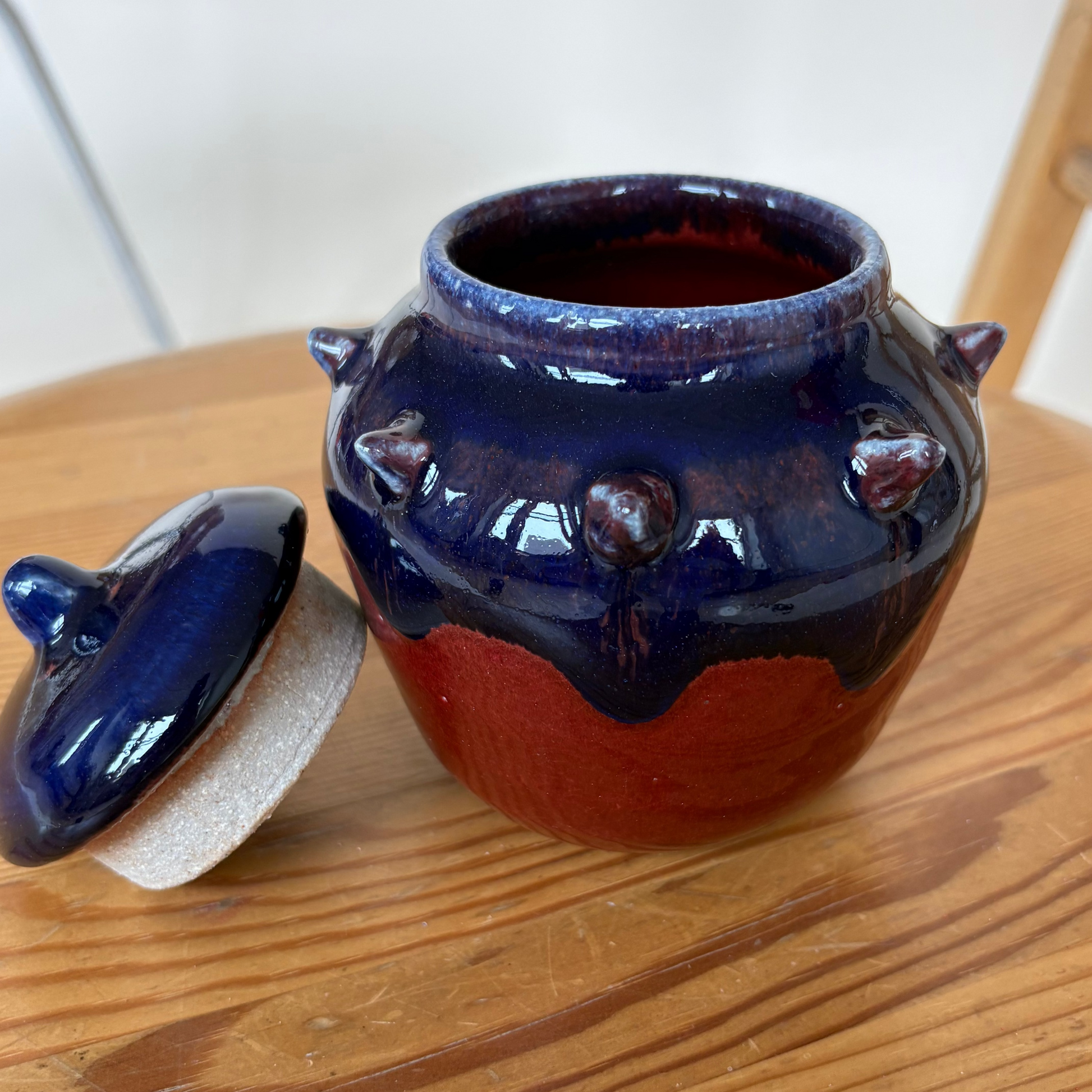Small spiked jar on white stoneware. Glazed with a glossy red and navy.