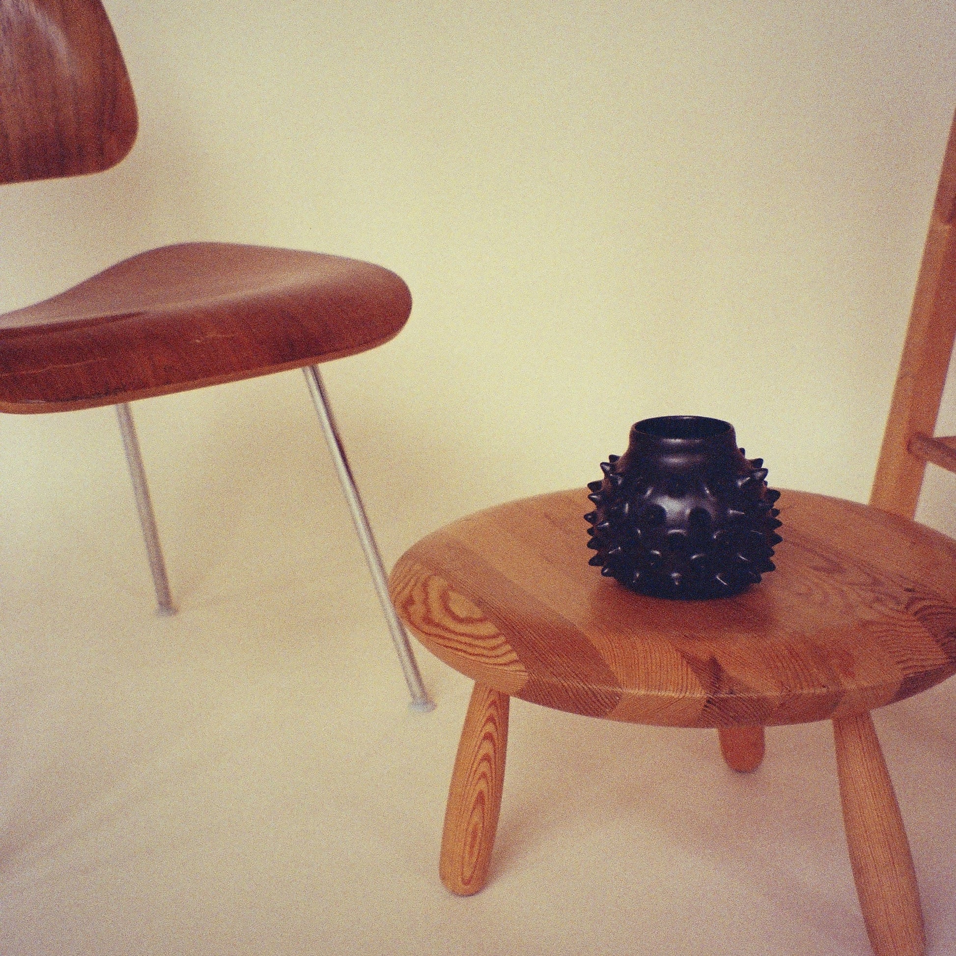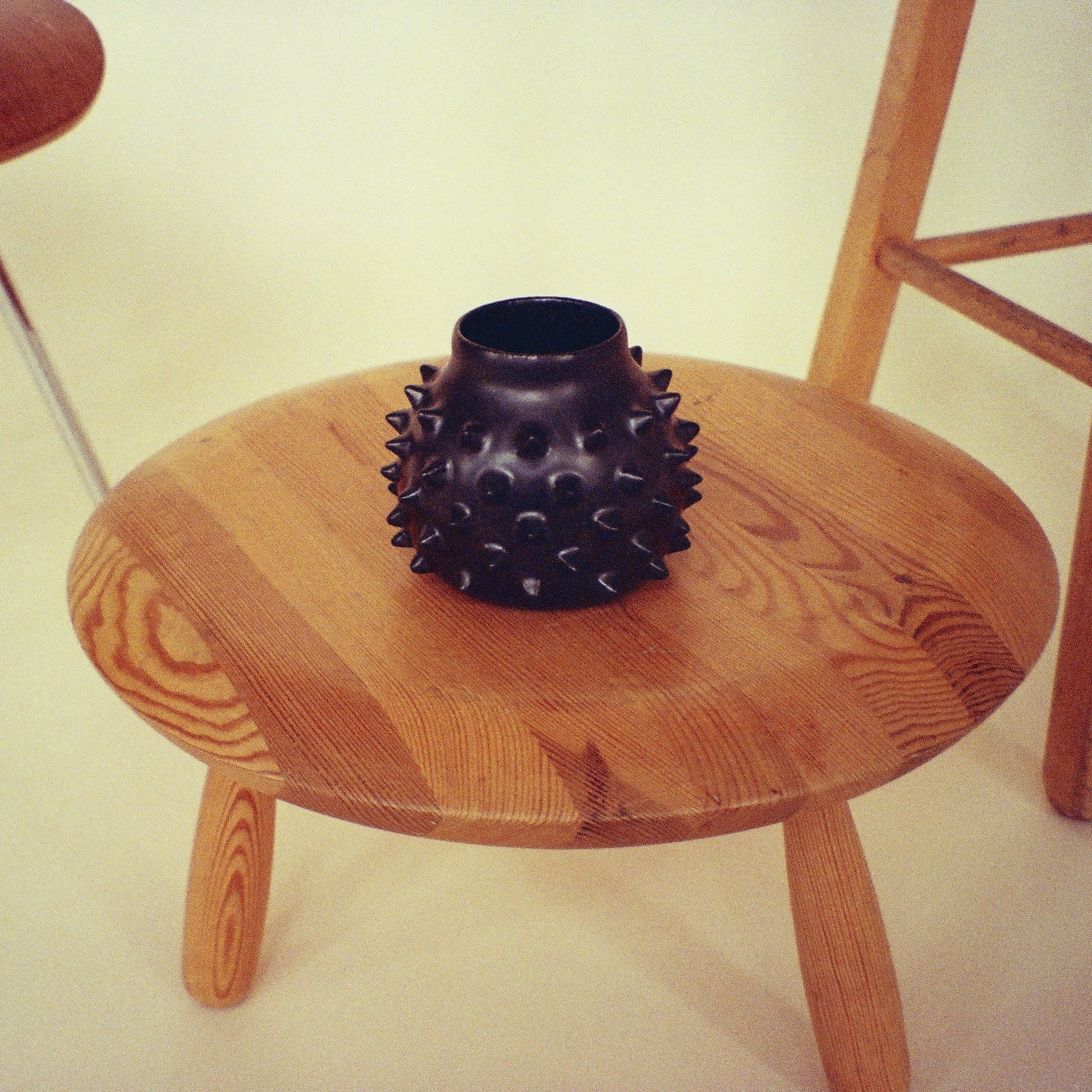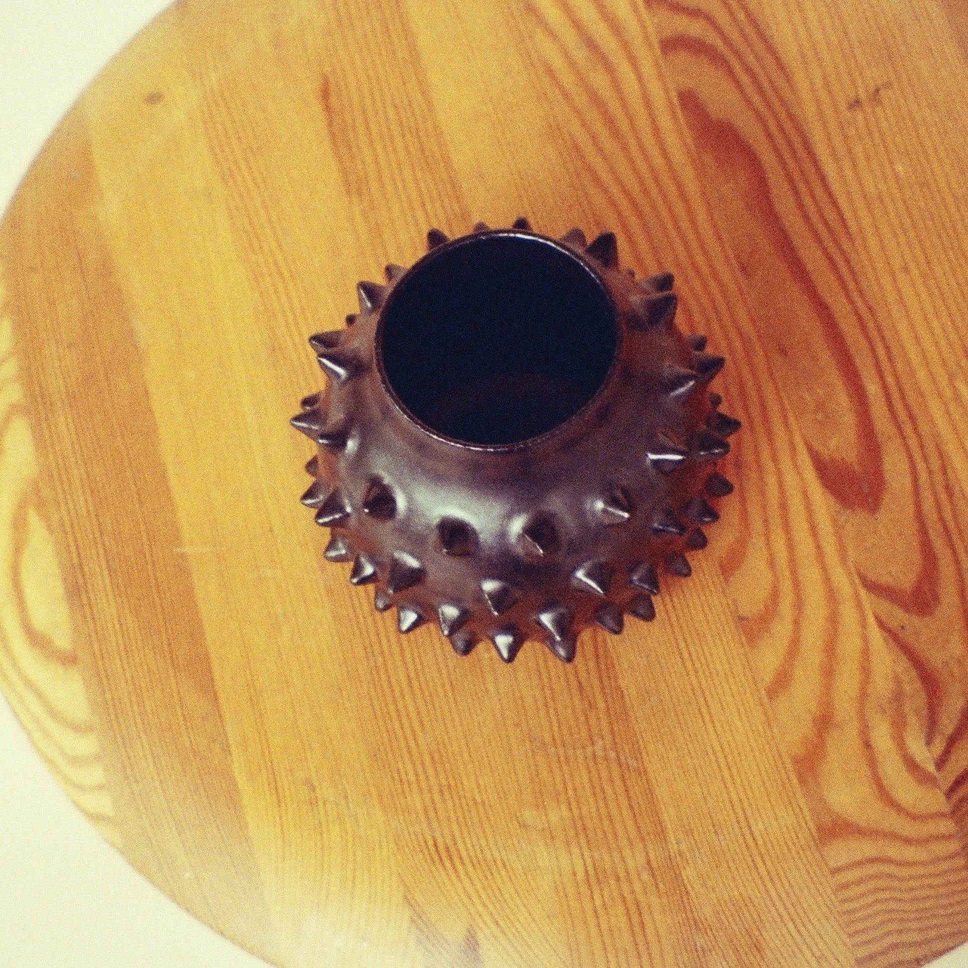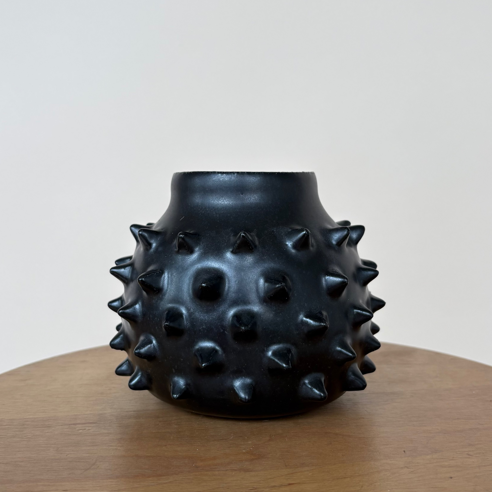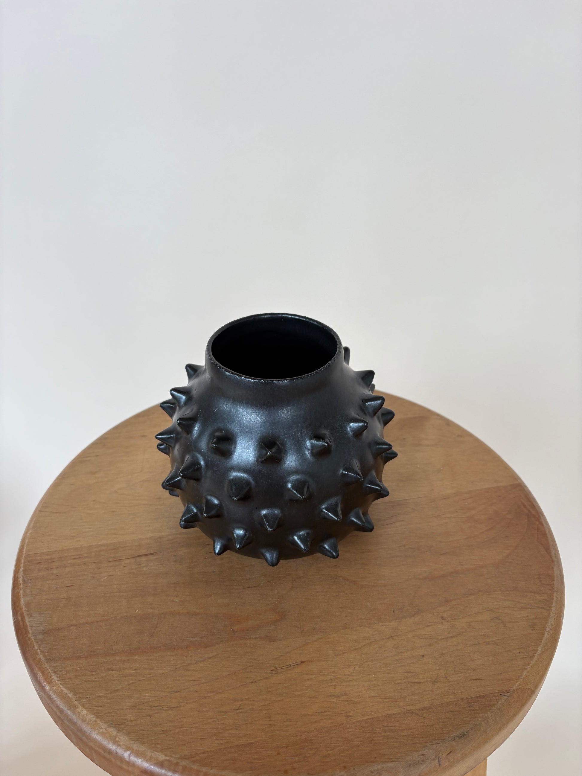 Small spiked vase on white stoneware. Individually made spikes with a black satin glaze.